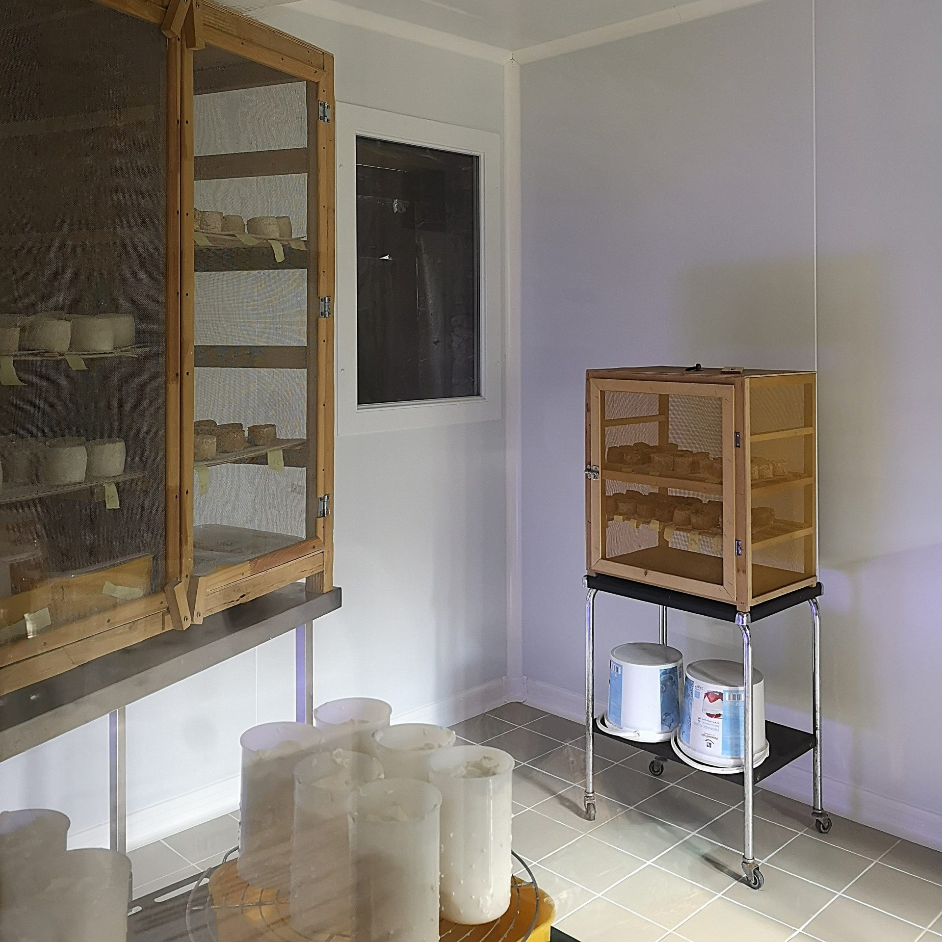 Le laboratoire de la fromagerie est l’endroit où se fabriquent les fromages de chèvre de La ferme du Paragard. Composée d’une seule salle, vous trouverez tout le nécessaire à leur fabrication. Par exemple, la table inox sur laquelle se fait le moulage et l’égouttage des fromages et l’évier de lavage. Une fois que les fromages de chèvres sont bien égouttés, ils seront stockés dans la cage. Vous pouvez voir l’entièreté du laboratoire à travers la grande vitre, et qui attise toujours votre curiosité lorsque vous venez à la ferme !